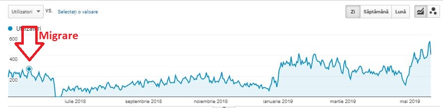 Dupa cum se poate observa si in imaginea de mai jos, la mai bine de o luna dupa migrare traficul organic al site-ului era undeva la 50-80 utilizatori pe zi.
